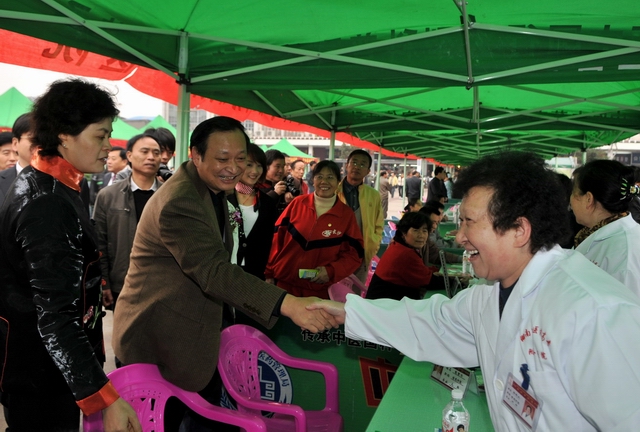 王国强副部长(左二)在甘霖副省长(左一)陪同下慰问义诊专家(巨锋摄)